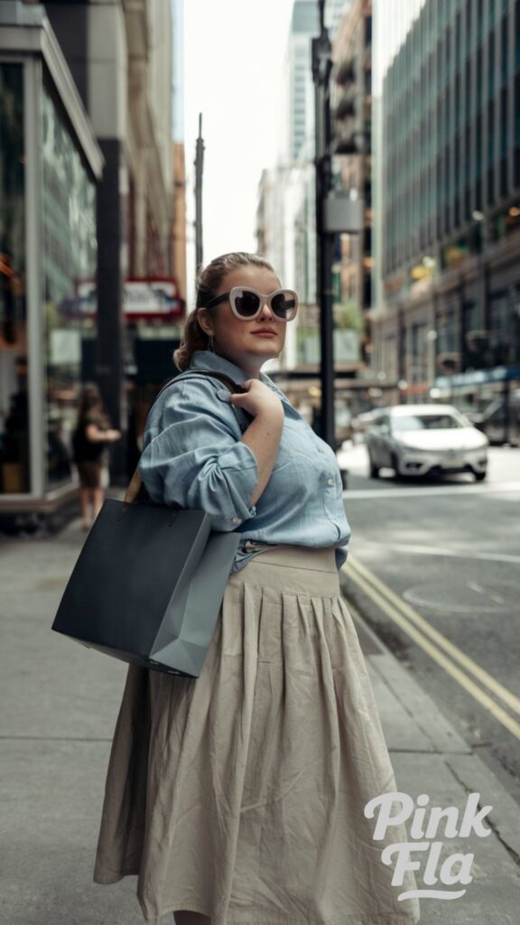 This plus-size woman redefines casual elegance with a refined yet approachable look built on soft tones and modern classics. Her pleated sky-blue skirt flows just right, striking the perfect balance between structure and grace. Paired with a crisp white button-down shirt—knotted casually at the waist—this outfit feels fresh, light, and quietly polished.