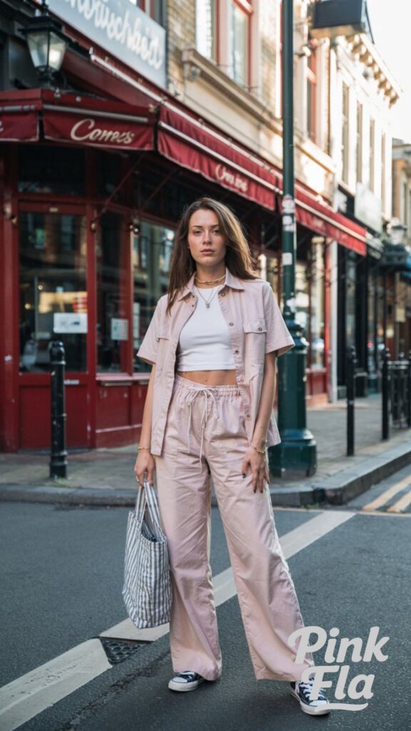A soft pink two-piece set offers the perfect mix of comfort and style. The drawstring pants fall loosely without clinging, giving you room to move as you go about your day. A white crop top keeps things clean and crisp, layered under a matching pink button-up shirt that adds a touch of polish.