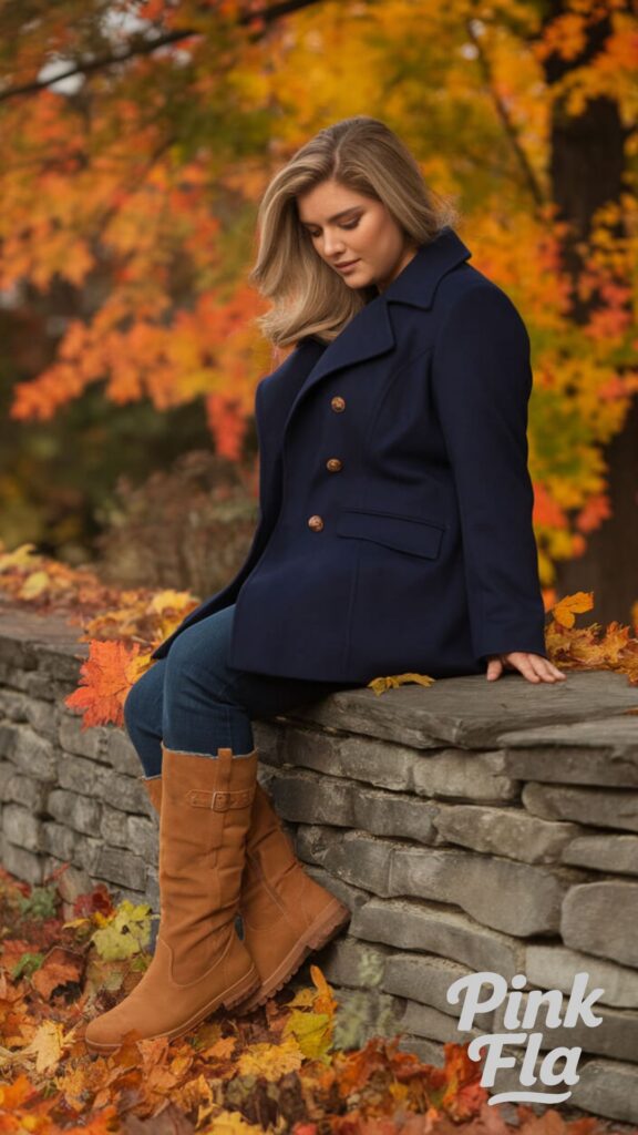 Enjoy a crisp fall day in this timeless outfit, featuring a classic navy peacoat, dark wash jeans, and versatile tan riding boots. The peacoat offers both essential warmth and a structured silhouette, making it a polished outer layer. The sturdy tan riding boots add an outdoorsy feel, perfect for autumn walks, while also providing comfort and durability.