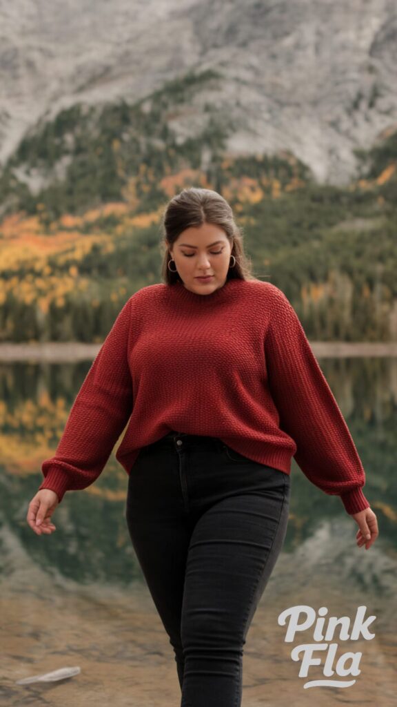 Paired with sleek high-waisted black jeans, it strikes a perfect balance between ultimate comfort and undeniable style. Add classic gold hoop earrings for a simple, elegant touch that pulls the whole look together, making it casually chic for any autumn lakeside adventure.
