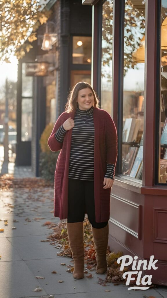 Breathe in the crisp autumn air with an outfit that’s both stylish and incredibly cozy. This look features a long burgundy knit cardigan layered effortlessly over a timeless striped turtleneck top for easy warmth and visual interest. The deep tones and classic patterns give it a versatile, polished feel that works for many occasions.