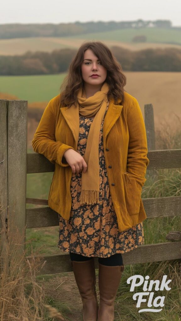 Welcome the fall season with this warm and stylish layered outfit, perfect for embracing crisp autumn days. The mustard corduroy jacket brings a cozy texture and stands out beautifully against the delicate floral print dress, creating a harmonious blend of earthy tones and soft patterns. A dark, soft scarf adds extra warmth and a touch of sophistication, making it ideal for chillier weather.
