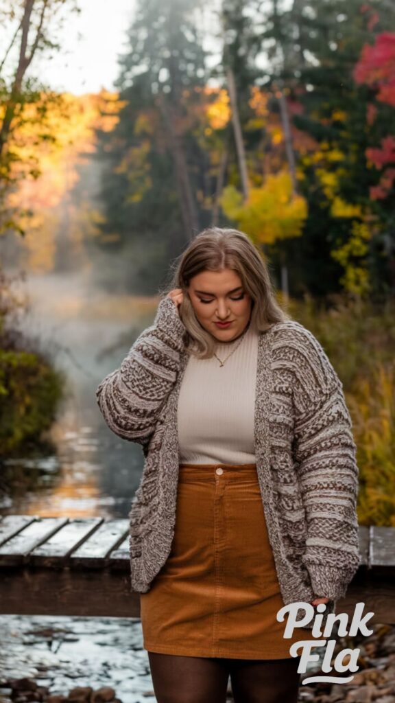 A tan corduroy skirt finishes the ensemble with a delightful nod to vintage charm and adds textural interest. It’s an easy, elegant outfit for enjoying the outdoors on a cool fall day, blending subtle sophistication with ultimate comfort.