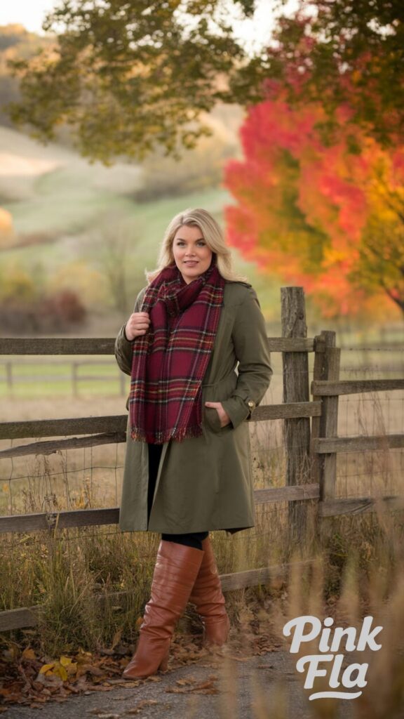 Welcome the season with an outfit that perfectly mixes cozy comfort and timeless style—ideal for a leisurely countryside walk or a relaxed day out. The olive green trench coat provides a sleek, flattering shape, offering both elegance and practicality. Meanwhile, a rich burgundy plaid scarf adds a warm pop of color that beautifully complements the changing fall leaves.